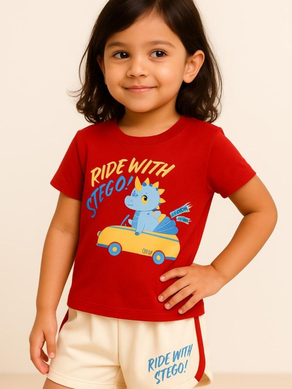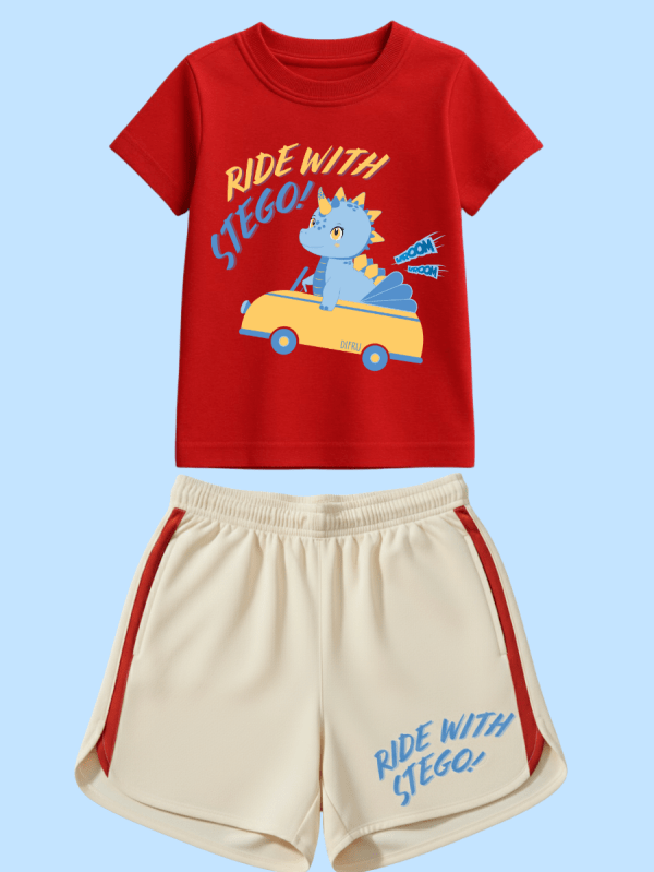 Kids red dino print t-shirt and cream shorts co-ord set with “Ride With Stego” theme