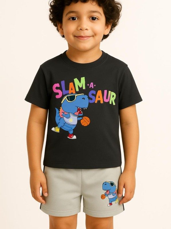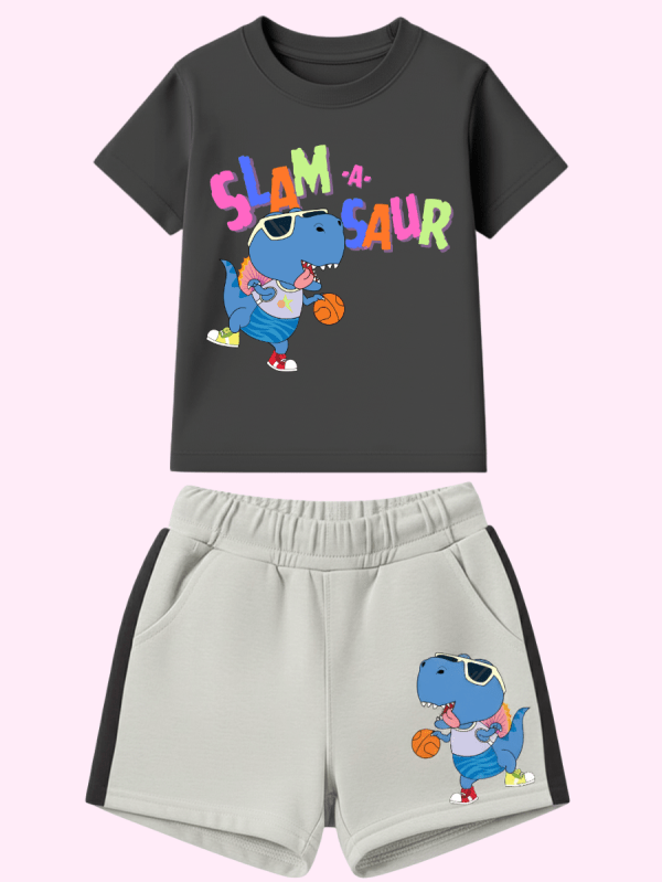 Kid's black t-shirt and grey shorts co-ord set featuring a cool Slam-a-Saur basketball dinosaur print.