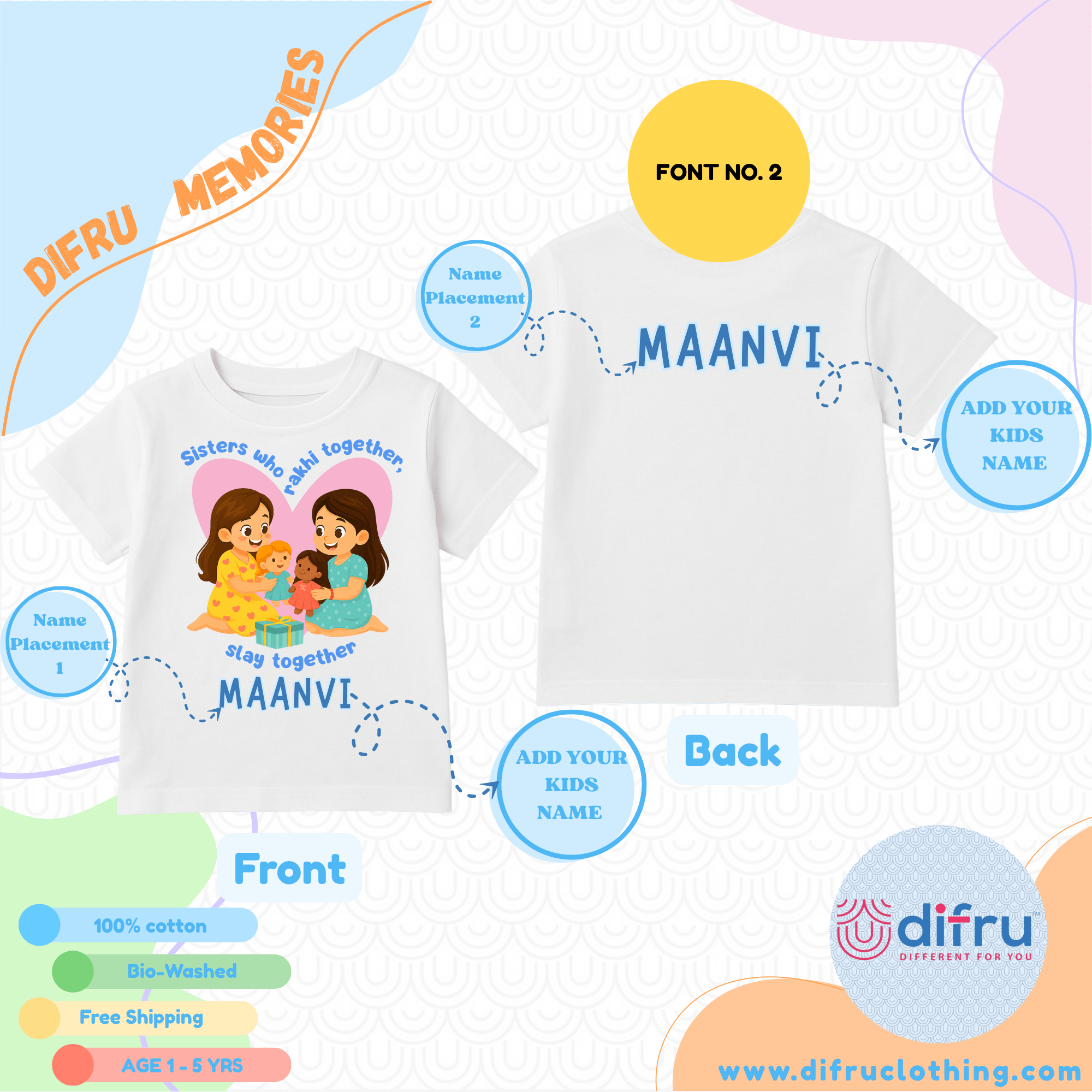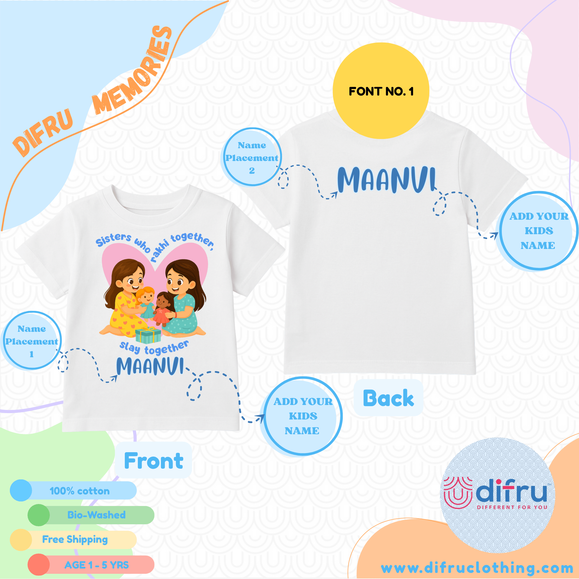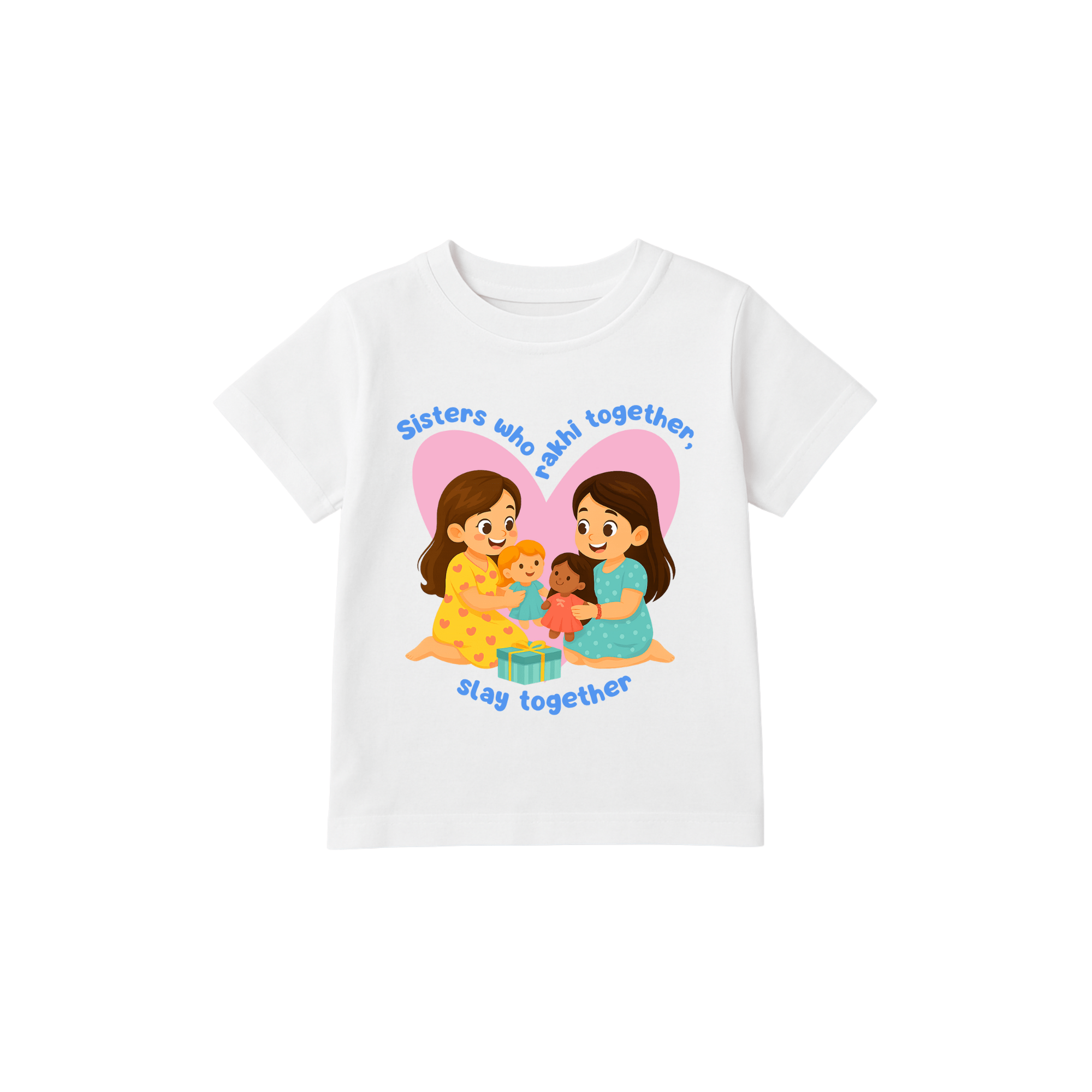 This Rakshabandhan, let your little girl twin in style with her sister or express her love for sibling bonds with our “Sisters Who Play Together, Stay Together” Kids T-Shirt. This heartwarming design features two sisters enjoying their dolls and playtime together—symbolizing the bond that makes childhood magical.